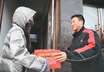春节期间,负责西安城北某人员密集小区派送工作的快递小哥罗飞龙(右)将快递送至客户手中。新华社记者 张博文 摄