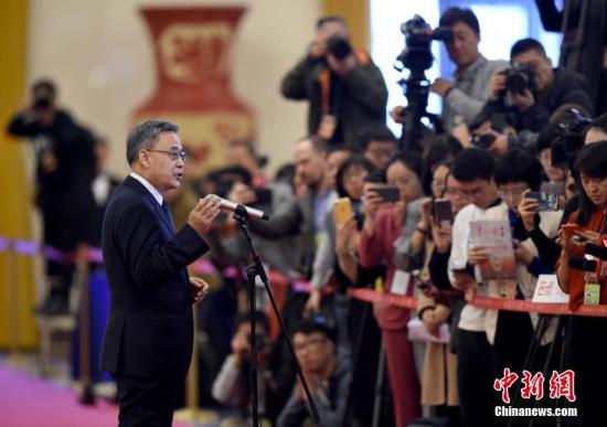 图为国务院台湾事务办公室主任刘结一在“部长通道”接受采访。中新社记者 侯宇 摄