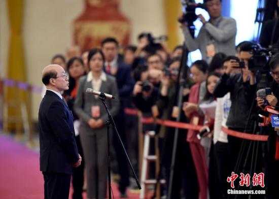 3月5日,十三届全国人大二次会议在北京人民大会堂开幕。图为工业和信息化部部长苗圩在“部长通道”接受采访。中新社记者 侯宇 摄