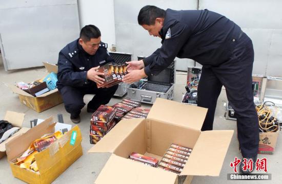 派出所民警在清点查缴的伪基站设备。(资料图) 中新社发 刘心中 摄 图片来源:CNSPHOTO