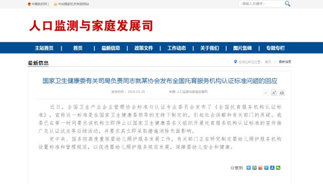 近日,全国卫生产业企业管理协会标准与认证专业委员会发布了《全国托育服务机构认证标准》,宣称这一标准是在国家卫生健康委领导的支持下制定的,引起社会误解和有关部门的质疑。我委已在第一时间要求该机构立即停止以国家卫生健康委名义组织开展托育服务机构认证标准的宣传推广及认证试点等后续活动,并要求其立即采取措施消除负面影响。