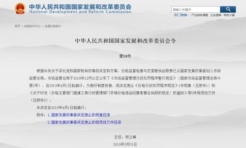 中新网4月1日电 据国家发改委网站消息,根据中央关于深化党和国家机构改革的决定和方案,价格监督检查与反垄断执法职责已从国家发展改革委划入市场监管总局。市场监管总局于2018年12月21日公布了《市场监督管理行政处罚程序暂行规定》(国家市场监督管理总局令第2号),自2019年4月1日起施行。