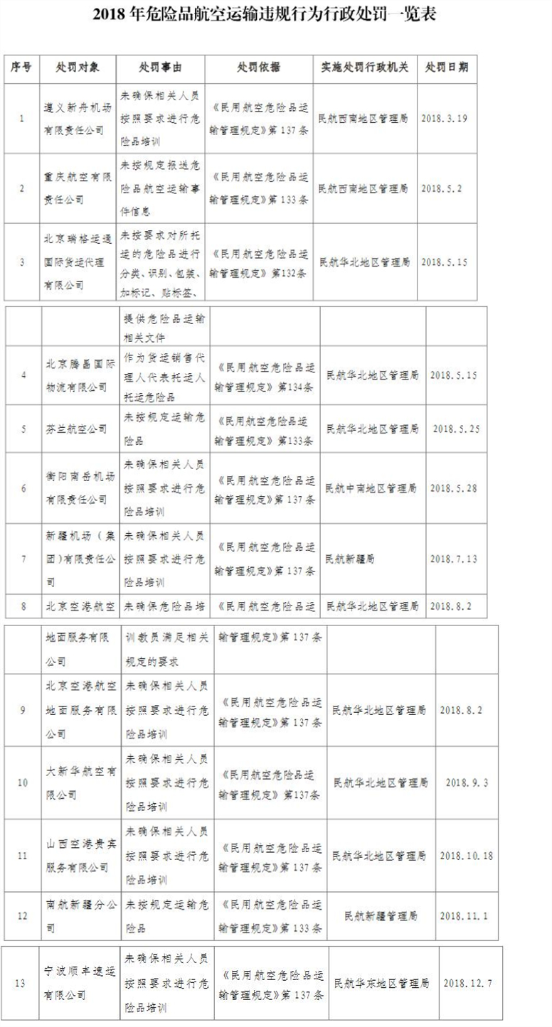 中新网5月5日电 据民航局网站消息,为进一步加强危险品航空运输管理,规范危险品航空运输秩序,充分发挥舆论监督作用,保障危险品航空运输安全,依据《民用航空危险品运输管理规定》第一百三十条的规定,现将2018年民航行业管理部门对违规航空运输危险品责任单位的行政处罚情况予以公告。