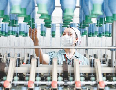 浙江宁波一家纺纱企业采用特殊加工方法,生产出具有独特混色效果的纱线。图为工人在车间工作。章勇涛摄(人民视觉)