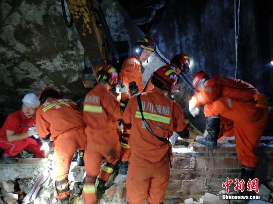 截至6月18日凌晨2时,四川省消防救援总队已调派宜宾、成都、自贡、泸州等地10个支队及总队全勤指挥部、总队战勤保障大队共116车、526人、4犬赶赴震中开展救援。图为宜宾长宁县双河镇葡萄村八组救援现场。文/中新社记者 刘忠俊 四川消防供图