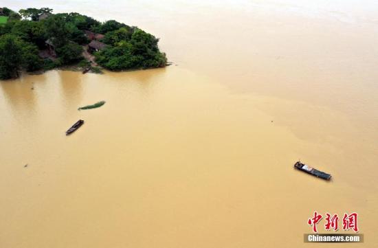 7月12日,航拍南昌县泾口乡金溪湖,因上游抚河洪水汇入湖泊导致水位上涨,湖畔数幢房屋被洪水围困。王昊阳 摄