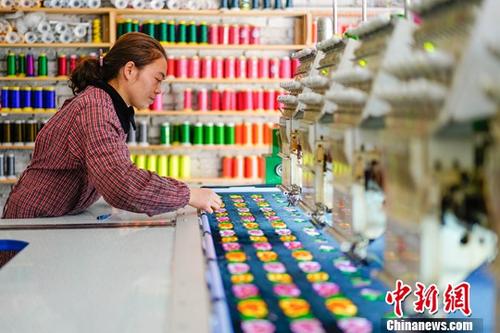 资料图:贵州省雷山县易地扶贫搬迁安置小区牛王寨一家刺绣加工厂。中新社记者 贺俊怡 摄