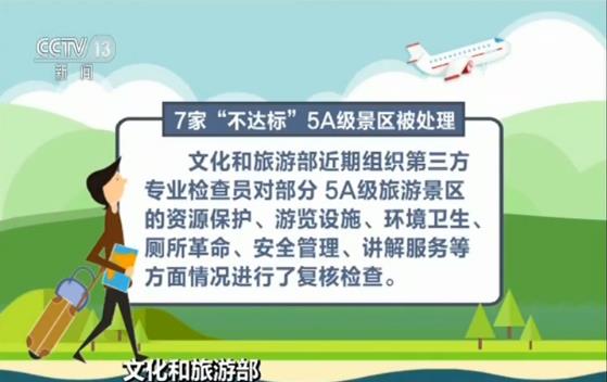文化和旅游部近期组织第三方专业检查员对部分5A级旅游景区的资源保护、游览设施、环境卫生、厕所革命、安全管理、讲解服务等方面情况进行了复核检查。