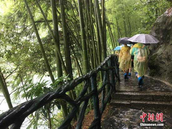 资料图:一景区内,游客雨中登山观美景。中新社记者 吴兰 摄中新社记者 吴兰 摄
