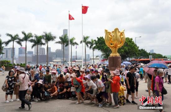 资料图:游客在香港金紫荆广场观光拍照。中新社记者 张炜 摄
