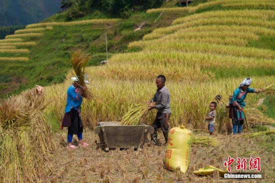 资料图片为:9月17日,贵州省榕江县阳开梯田,苗族民众在田间收割稻谷。 中新社记者 贺俊怡 摄