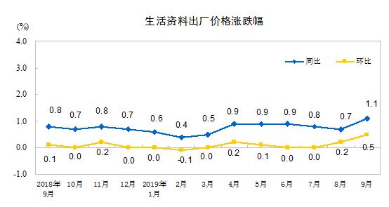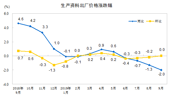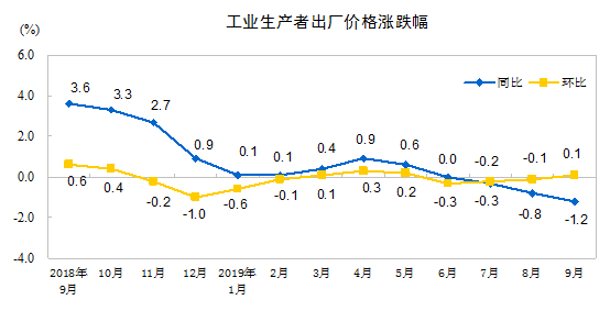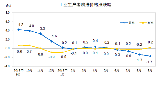 2019年9月份,全国工业生产者出厂价格同比下降1.2%,环比上涨0.1%;工业生产者购进价格同比下降1.7%,环比上涨0.2%。1—9月平均,工业生产者出厂价格与去年同期持平,工业生产者购进价格下降0.3%。