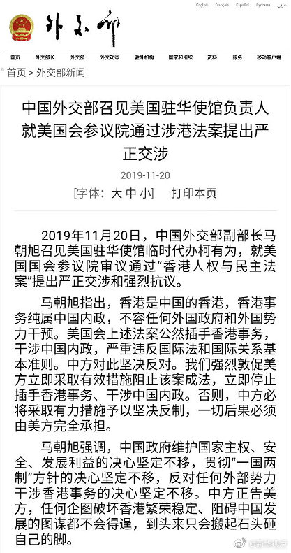 马朝旭指出,香港是中国的香港,香港事务纯属中国内政,不容任何外国政府和外国势力干预。美国会上述法案公然插手香港事务,干涉中国内政,严重违反国际法和国际关系基本准则。中方对此坚决反对。我们强烈敦促美方立即采取有效措施阻止该案成法,立即停止插手香港事务、干涉中国内政。否则,中方必将采取有力措施予以坚决反制,一切后果必须由美方完全承担。