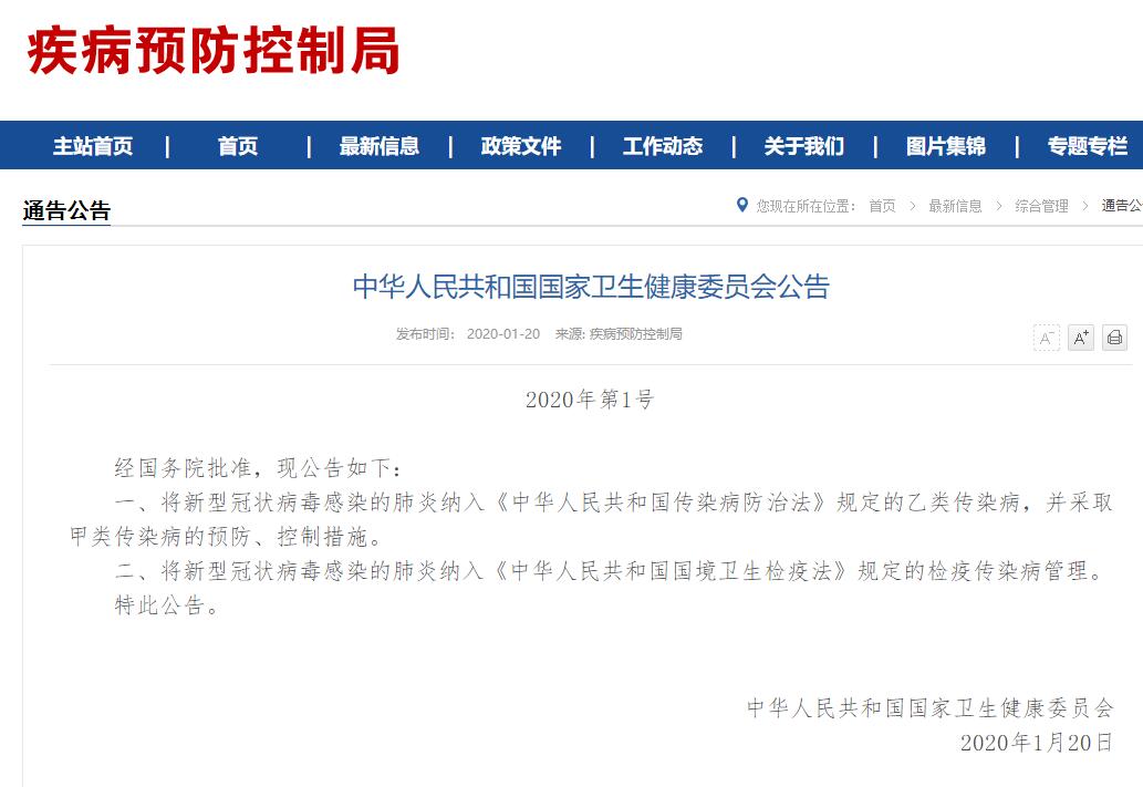人民网北京1月21日电 据卫健委网站消息,中华人民共和国国家卫生健康委员会发布公告,将新型冠状病毒感染的肺炎纳入《中华人民共和国传染病防治法》规定的乙类传染病,并采取甲类传染病的预防、控制措施。将新型冠状病毒感染的肺炎纳入《中华人民共和国国境卫生检疫法》规定的检疫传染病管理。公告全文如下: