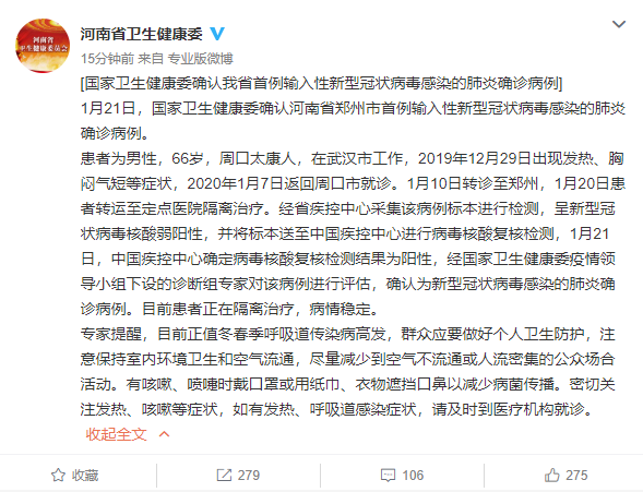 1月21日,国家卫生健康委确认河南省郑州市首例输入性新型冠状病毒感染的肺炎确诊病例。