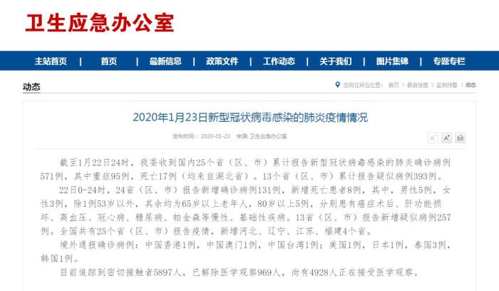 中新网1月23日电 据国家卫健委网站消息,截至1月22日24时,共收到国内25个省(区、市)累计报告新型冠状病毒感染的肺炎确诊病例571例,其中重症95例,死亡17例(均来自湖北省)。13个省(区、市)累计报告疑似病例393例。