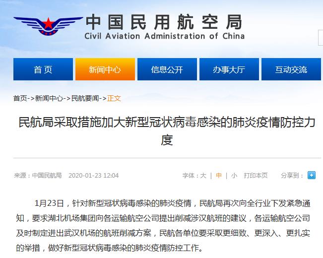 央视网消息:据民航局网站消息,针对新型冠状病毒感染的肺炎疫情,民航局1月23日再次向全行业下发紧急通知,要求湖北机场集团向各运输航空公司提出削减涉汉航班的建议,各运输航空公司及时制定进出武汉机场的航班削减方案,民航各单位要采取更细致、更深入、更扎实的举措,做好新型冠状病毒感染的肺炎疫情防控工作。