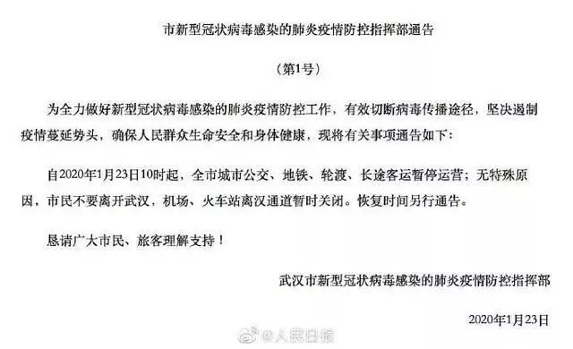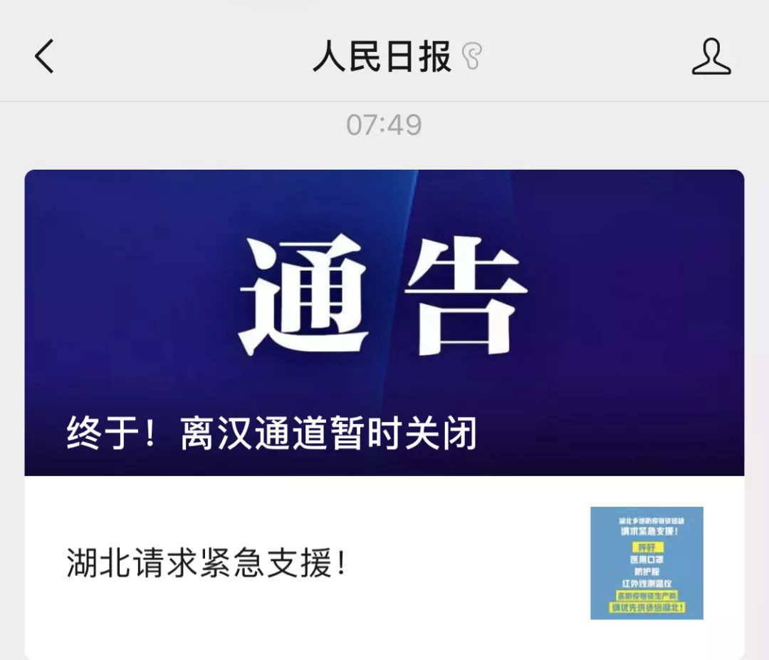 人民日报微信公众号23日早发出通告:离汉通道暂时关闭!