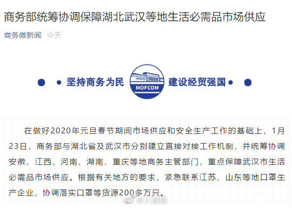 据商务部,23日,商务部统筹协调安徽、江西、河南、湖南、重庆等地商务主管部门,重点保障武汉市生活必需品市场供应。根据有关地方的要求,紧急联系江苏、山东等地口罩生产企业,协调落实口罩等货源200多万只。