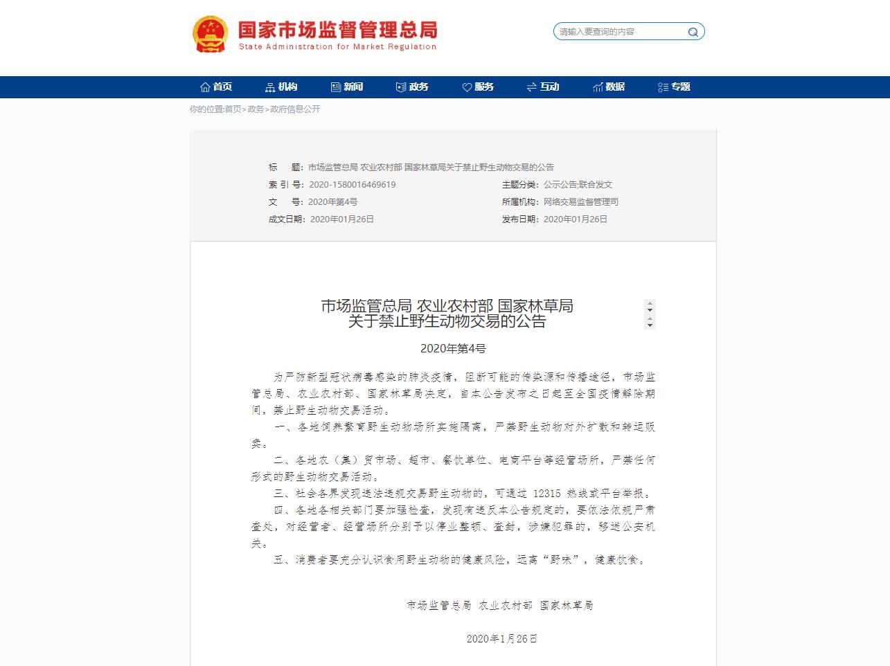 为严防新型冠状病毒感染的肺炎疫情,阻断可能的传染源和传播途径,市场监管总局、农业农村部、国家林草局决定,自公告发布之日起至全国疫情解除期间,禁止野生动物交易活动。