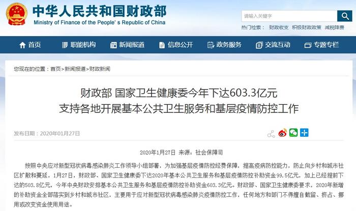 中新网客户端1月27日电(李金磊) 1月27日,财政部、国家卫生健康委下达2020年基本公共卫生服务和基层疫情防控补助资金99.5亿元,加上已经提前下达的503.8亿元,今年中央财政安排基本公共卫生服务和基层疫情防控补助资金603.3亿元。财政部、国家卫生健康委要求,2020年新增的补助资金全部落实到乡村和城市社区,主要用于应对新型冠状病毒感染肺炎疫情防控工作,任何地方和部门不得擅自截留、挤占、挪用或改变资金使用用途。