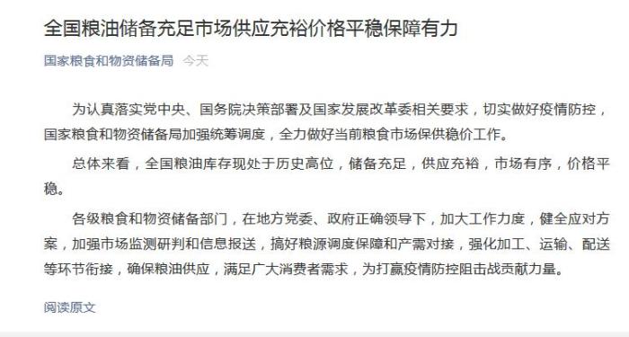 为认真落实党中央、国务院决策部署及国家发展改革委相关要求,切实做好疫情防控,国家粮食和物资储备局加强统筹调度,全力做好当前粮食市场保供稳价工作。