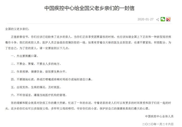 中新网1月27日电 据中国疾控中心官方网站消息,26日,中国疾控中心发布《给全国父老乡亲们的一封信》,信上指出,为了您自己,为了您的家人,外出时要佩戴口罩,不聚会、聚餐,不要去人多的地方。