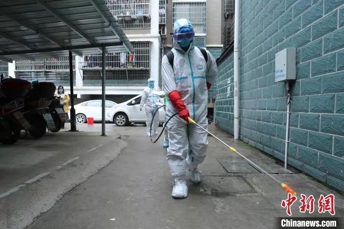 1月25日,江西省瑞昌市疾控中心工作人员在小区消毒。 魏东升 摄