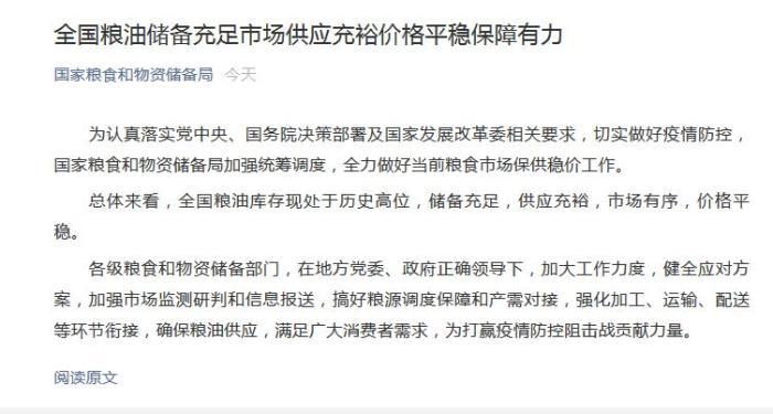 国家粮食和物资储备局表示,各级粮食和物资储备部门,将加大工作力度,健全应对方案,加强市场监测研判和信息报送,做好粮源调度保障和产需对接,强化加工、运输、配送等环节衔接,确保粮油供应,满足广大消费者需求,为打赢疫情防控阻击战贡献力量。