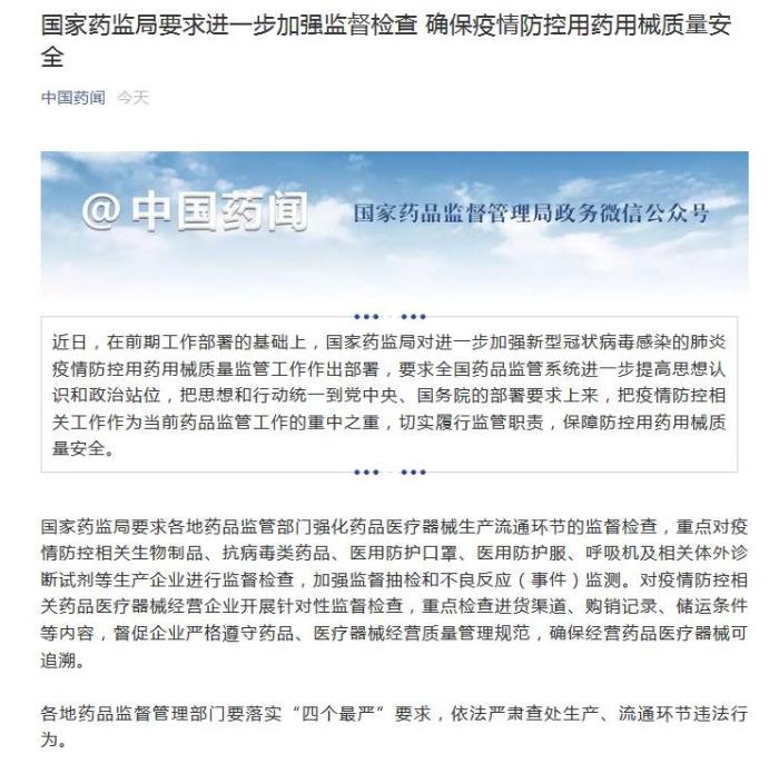 国家药监局要求,对疫情防控相关药品医疗器械经营企业开展针对性监督检查,重点检查进货渠道、购销记录、储运条件等内容,督促企业严格遵守药品、医疗器械经营质量管理规范,确保经营药品医疗器械可追溯。