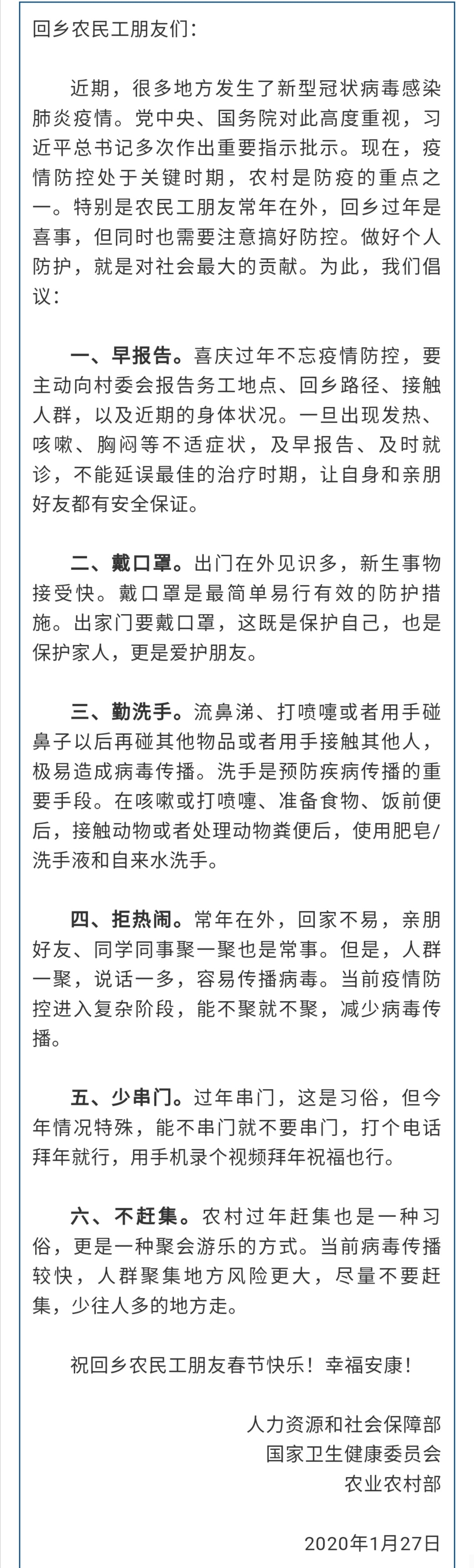 中新网客户端1月27日电(李金磊) 1月27日,人社部、国家卫健委、农业农村部发布致回乡农民工朋友们的倡议书。倡议书指出,疫情防控处于关键时期,农村是防疫的重点之一,倡议早报告、戴口罩、勤洗手、拒热闹、少串门、不赶集。当前疫情防控进入复杂阶段,能不聚就不聚,减少病毒传播。