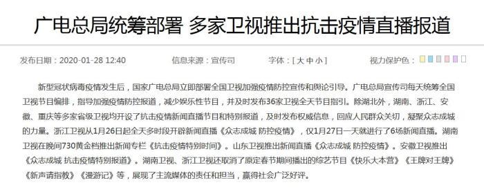 (抗击新型肺炎)中国广电总局:加强疫情防控报道,多家卫视推出相关直播