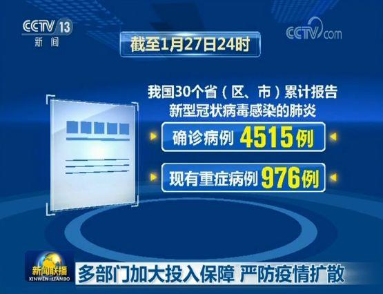 国家卫生健康委通报:截至1月27日24时,我国30个省(区、市)累计报告确诊病例4515例,现有重症病例976例,累计死亡病例106例,累计治愈出院60例。现有疑似病例6973例。