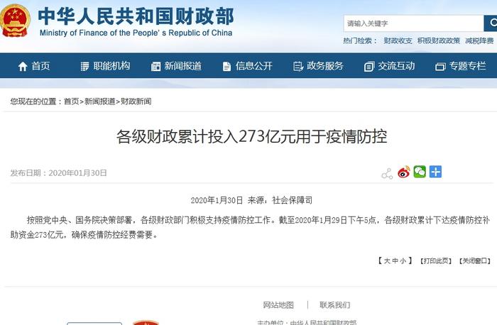 中新网客户端1月30日电(李金磊) 记者从财政部获悉,按照党中央、国务院决策部署,各级财政部门积极支持疫情防控工作。截至2020年1月29日下午5点,各级财政累计下达疫情防控补助资金273亿元,确保疫情防控经费需要。