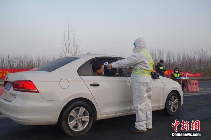 1月31日,为了防控新型冠状病毒感染的肺炎疫情,京沪高速武清西收费站对来津车辆和人员进行防疫检查。工作人员对车辆外表消毒,并对车上人员测量体温。中新社记者 贾天勇 摄
