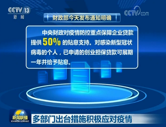 财政部今天(2月2日)发布通知明确,中央财政对疫情防控重点保障企业贷款提供50%的贴息支持。对感染新型冠状病毒的个人,已申请的创业担保贷款可展期一年并给予贴息。同时,对受疫情影响的小微企业,各级政府性融资担保再担保机构降低担保费率,取消反担保要求。对重点地区,国家融资担保基金减半收取再担保费。国家政策性银行——中国农业发展银行启用信贷业务应急通道,支持企业生产销售口罩、防护服及医药等疫情防控产品。