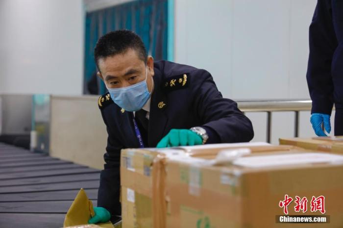 图为海关人员在检查口罩。中新社记者 吕品 摄