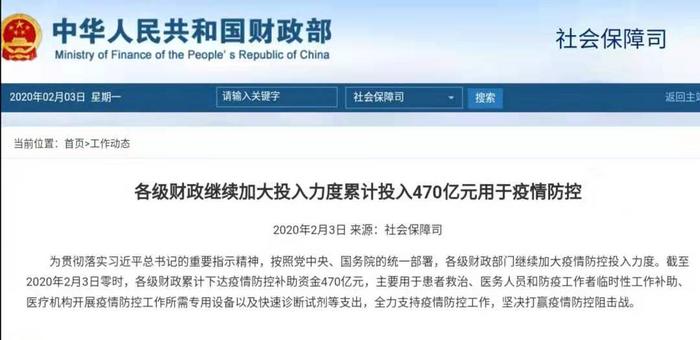 中新网客户端2月3日电(李金磊) 记者从财政部获悉,截至2020年2月3日零时,各级财政累计下达疫情防控补助资金470亿元,主要用于患者救治、医务人员和防疫工作者临时性工作补助、医疗机构开展疫情防控工作所需专用设备以及快速诊断试剂等支出,全力支持疫情防控工作,坚决打赢疫情防控阻击战。