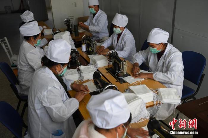 2月3日,志愿者们自带缝纫机无偿制作棉纱医用口罩。云南省安宁市60名志愿者在疫情期间无偿生产棉纱医用防护口罩以缓解市场资源紧缺。中新社记者 康平 摄