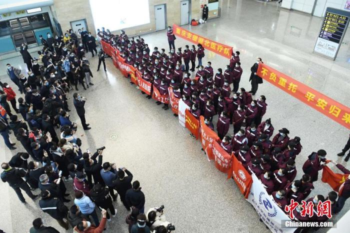 资料图:2月2日,重庆市第三批市级医疗队队员抵达重庆江北国际机场T2航站楼,准备飞赴湖北,支援湖北抗击新型冠状病毒感染的肺炎疫情。 陈超 摄