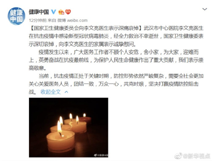 武汉市中心医院李文亮医生在抗击疫情中感染新型冠状病毒肺炎,经全力救治不幸逝世,国家卫生健康委表示深切哀悼,向李文亮医生的家属表示诚挚慰问。