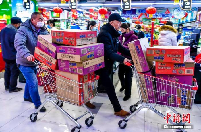 1月30日,新疆乌鲁木齐七一酱园超市,社区工作人员购买方便面。该超市是乌鲁木齐一家大型综合超市,近期该超市积极储备各类商品,尤其是蔬菜、肉食、副食品等,以满足民众日常需求。中新社记者 刘新 摄
