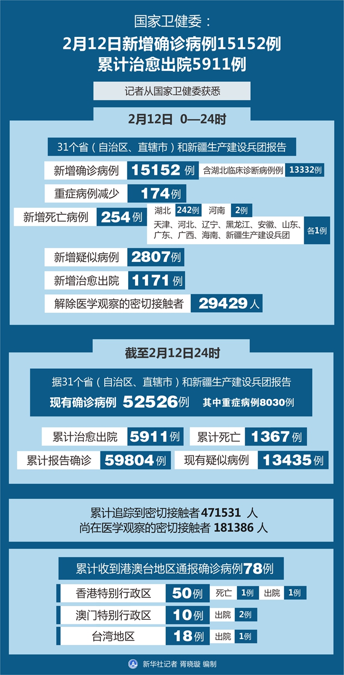 截至2月12日24时,据31个省(自治区、直辖市)和新疆生产建设兵团报告,现有确诊病例52526例(其中重症病例8030例),累计治愈出院病例5911例,累计死亡病例1367例,累计报告确诊病例59804例,现有疑似病例13435例。累计追踪到密切接触者471531人,尚在医学观察的密切接触者181386人。