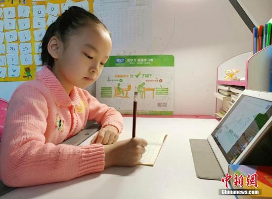 2月10日,河北石家庄,小学生们正在家中通过电脑、平板电脑等收看直播上课。中新社记者 翟羽佳 摄