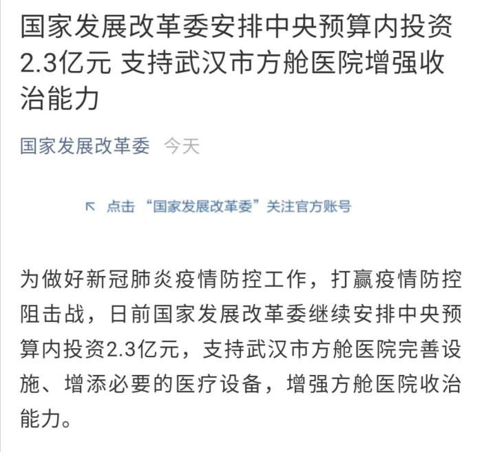 中新网客户端2月16日电(李金磊)为做好新冠肺炎疫情防控工作,打赢疫情防控阻击战,日前国家发展改革委继续安排中央预算内投资2.3亿元,支持武汉市方舱医院完善设施、增添必要的医疗设备,增强方舱医院收治能力。