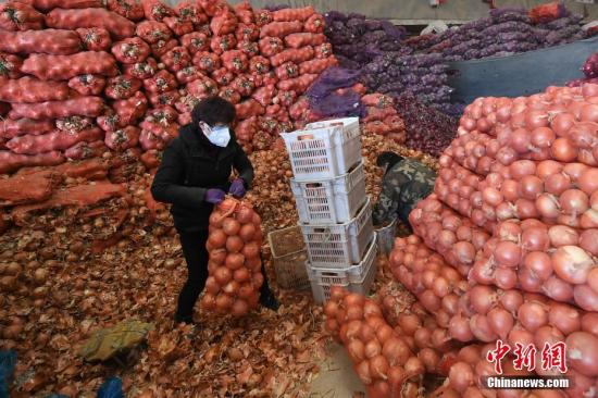商贩佩戴口罩整理待售蔬菜等。中新社记者 武俊杰 摄
