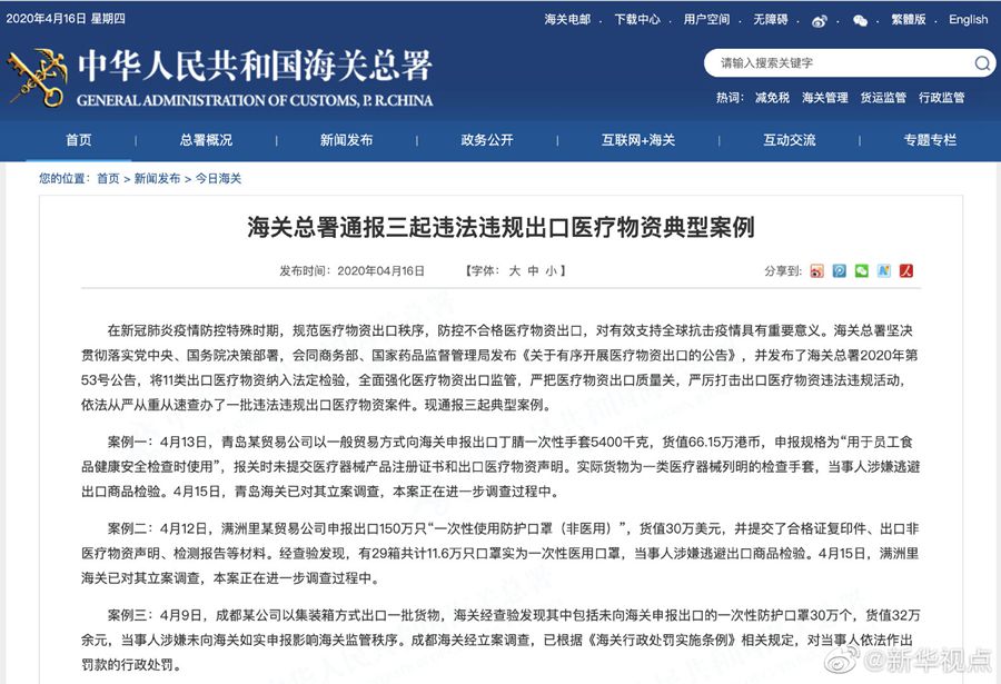 海关总署16日通报三起违法违规出口医疗物资典型案例,当事人均涉嫌未向海关如实申报,涉嫌逃避出口商品检验,受到立案调查或行政处罚。海关总署有关负责人表示,将采取多种联合惩戒措施,让违法者“一处失信,处处受限”。比如,企业被处罚的,海关将向商务主管部门通报企业被处罚信息,由其暂停企业的对外贸易经营活动,海关根据商务主管部门的决定对该企业的进出口货物不予办理报关验放。(记者刘红霞)