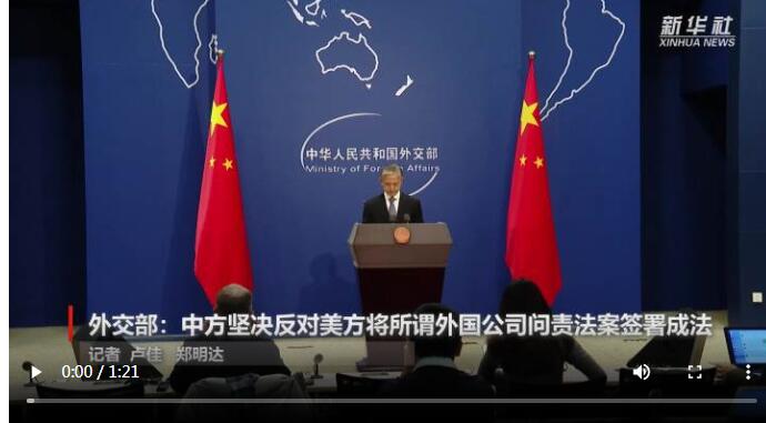 【简介】外交部发言人汪文斌21日说,美方不顾中方监管部门与美方开展审计监管合作的积极努力,执意将含有明显歧视中国企业条款的所谓“外国公司问责法案”签署成法,中方对此表示坚决反对。“我们敦促美方不得实施该法中的涉华歧视性条款,停止将证券监管政治化的错误做法,与中方监管部门在相互尊重基础上共同推进两国审计监管合作,为包括中国企业在内的各国企业在美上市提供公平、公正、非歧视的监管环境。”