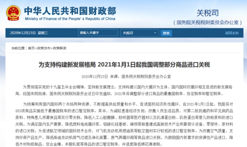 原标题:为支持构建新发展格局 2021年1月1日起我国调整部分商品进口关税