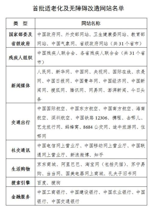 开展互联网主要行业网站适老化及无障碍改造。紧密结合老年人、残疾人等群体的实际需求,对《工业和信息化部中国残疾人联合会关于推进信息无障碍的指导意见》(工信部联信管〔2020〕146号)中提出的与老年人、残疾人等群体工作、生活密切相关的公共服务类网站开展适老化及无障碍改造。首批优先推动国家相关部委及省级人民政府、残疾人组织、新闻媒体、交通出行、金融服务、社交通讯、生活购物、搜索引擎等8大类、共115家网站进行改造(网站名单见附件1)。中国互联网协会协助基础电信企业及网站接入服务商加快互联网无障碍服务体系建设,持续推动互联网信息无障碍环境建设健康发展。